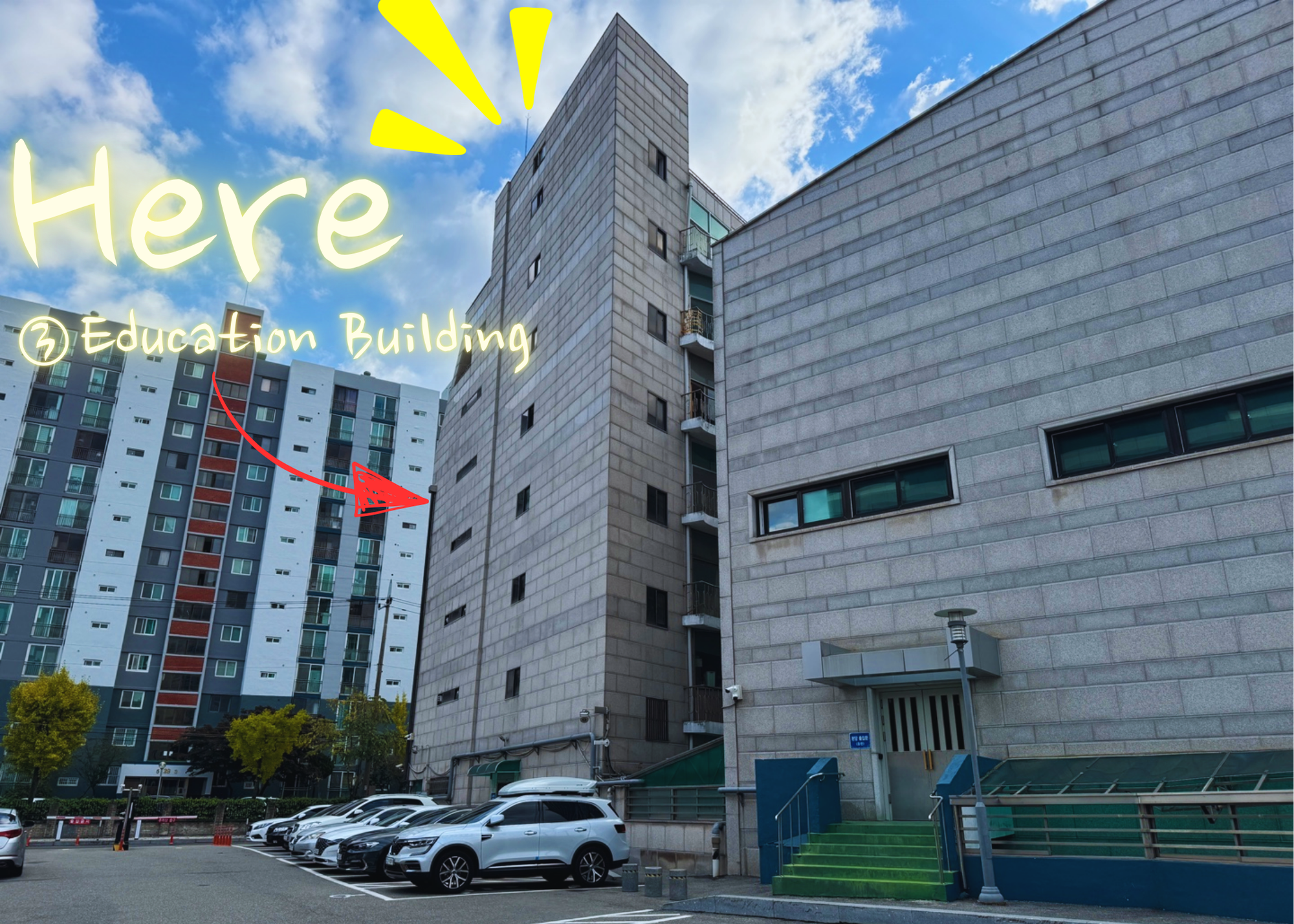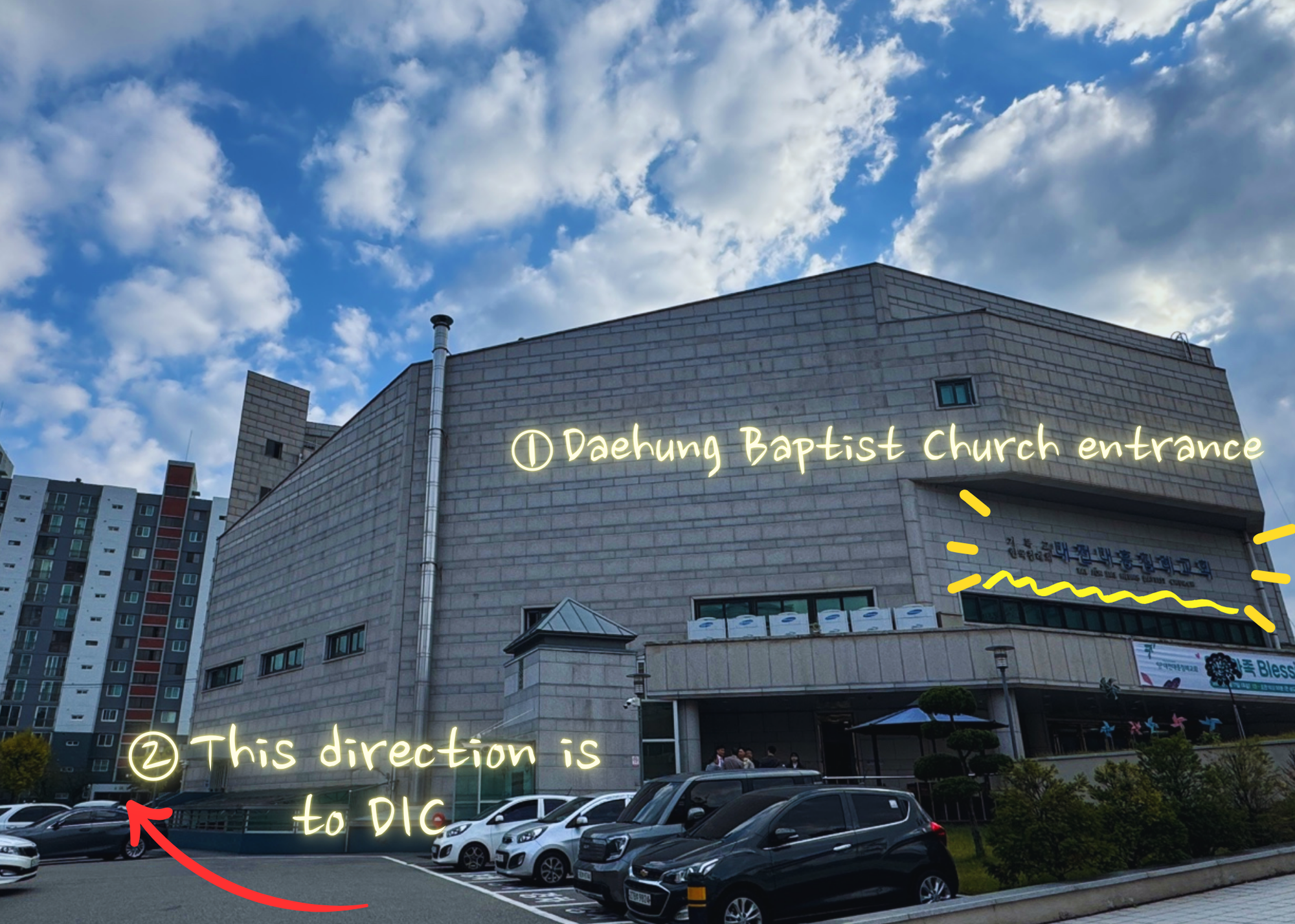 Step 02. Look for the Daehung Baptist Church Education Center. If you’re standing facing the main building of Daehung Baptist Church, the Education Center is located to the left. Be careful not to confuse it with the Mission Center building on your right!