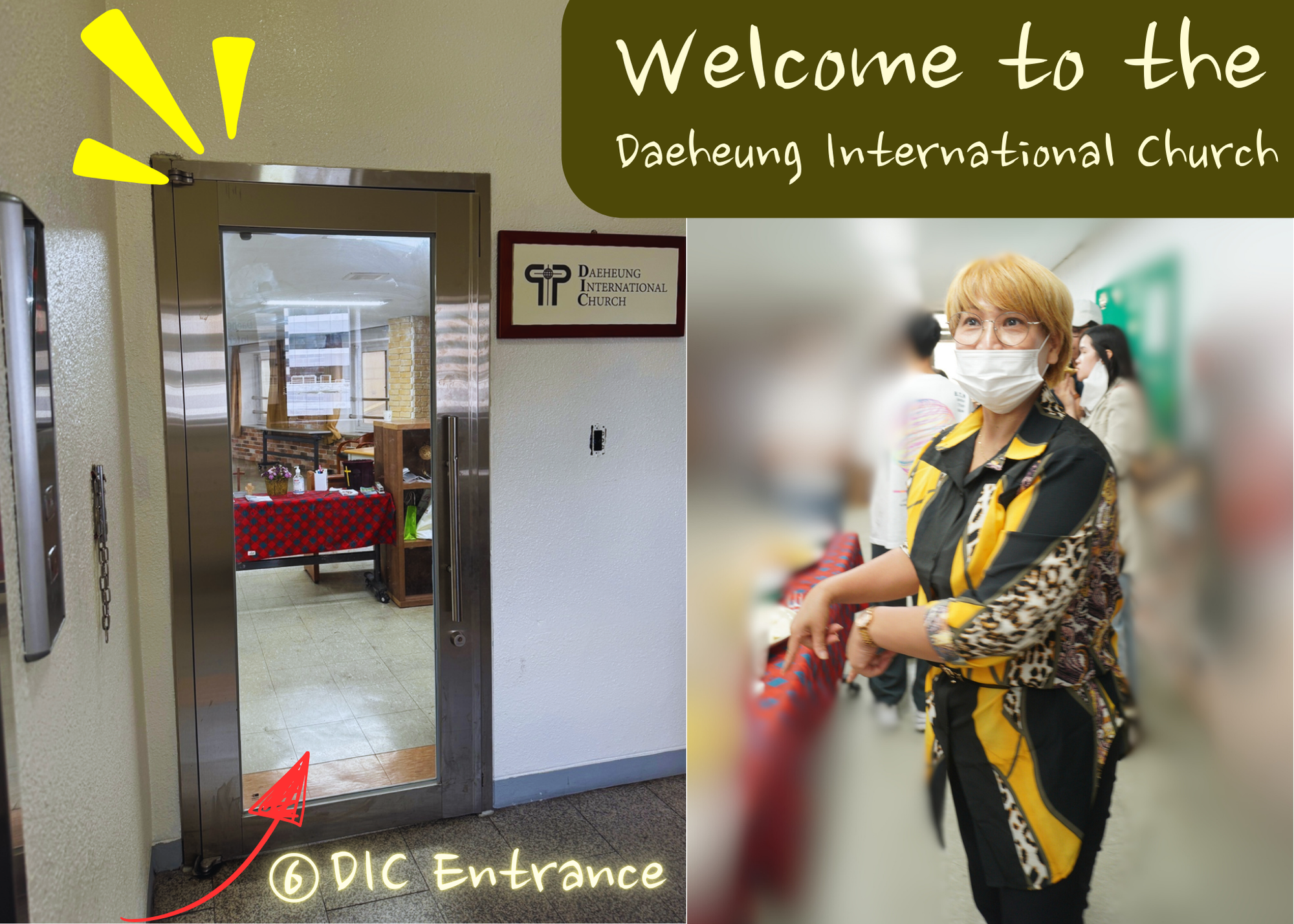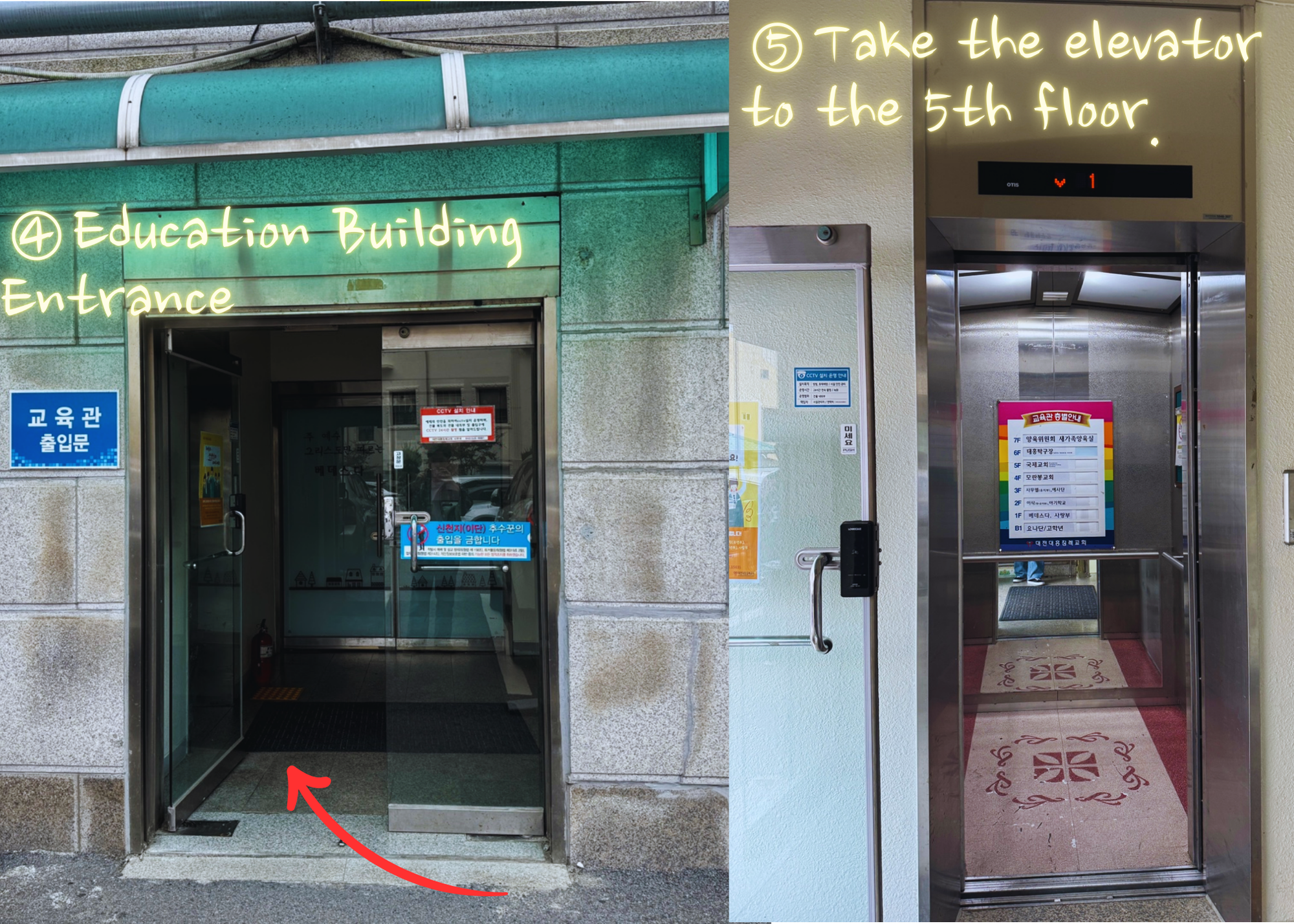 Step 01. Enter the address for Daehung Baptist Church and follow it to arrive. If you find an entrance that looks like the one shown below, you’re in the right place.